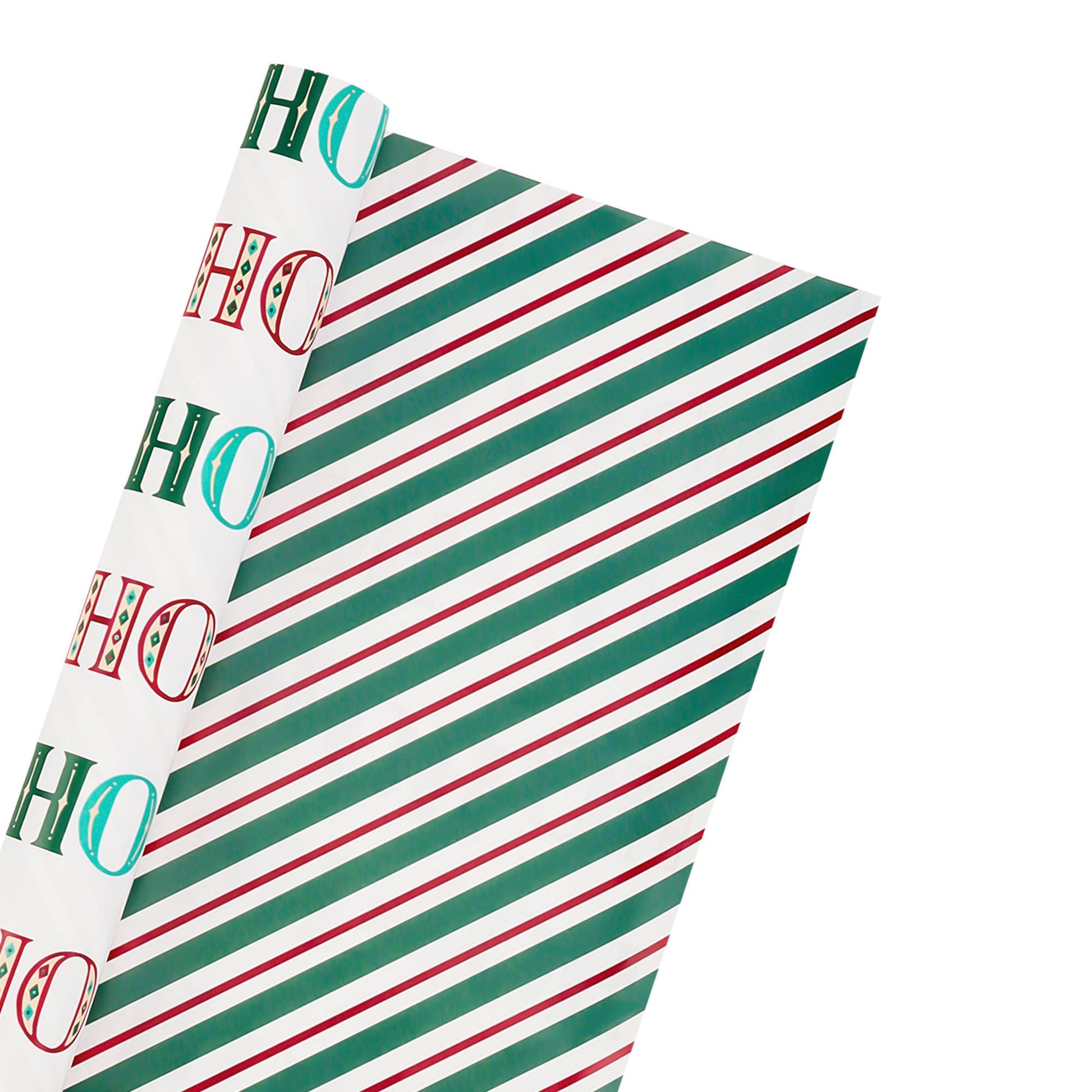 30" x 10’ Holiday Reversible Wrapping Paper | Large HO HO HO/Green, White and Red Diagonal Stripe