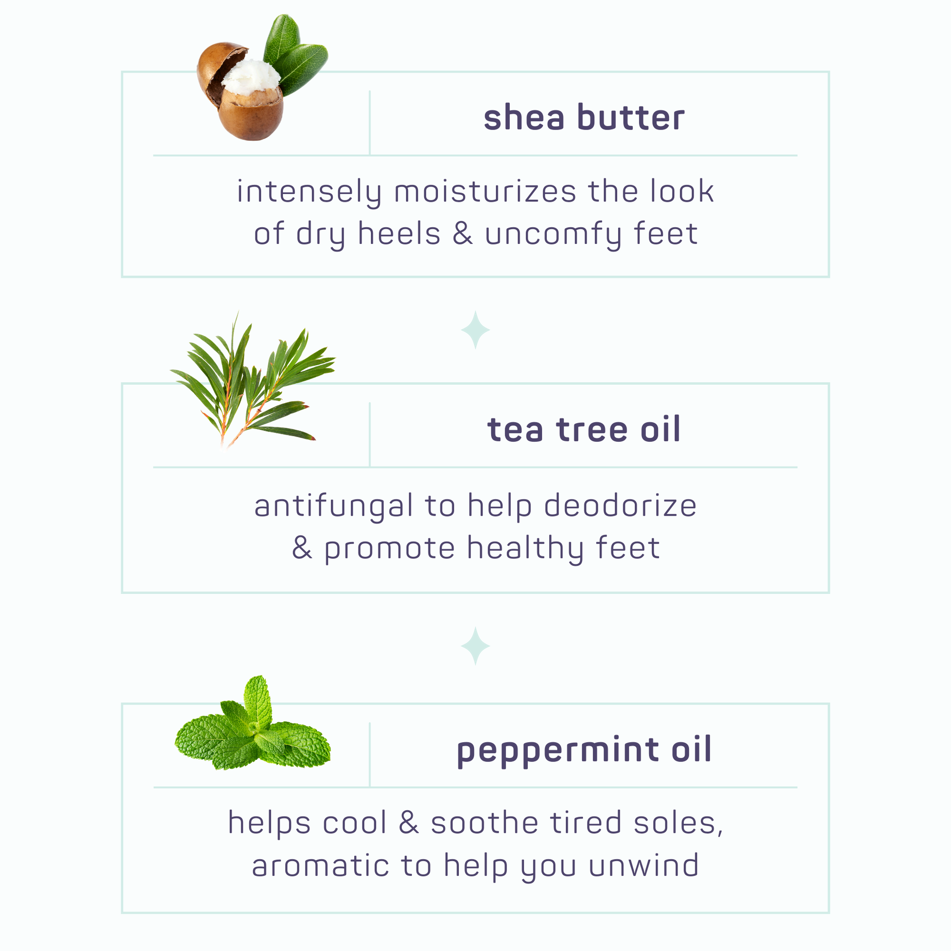 Infused with ultra-rich shea butter, anti-fungal tea tree oil & cooling peppermint to help refresh, deodorize, and soothe hardworking feet.