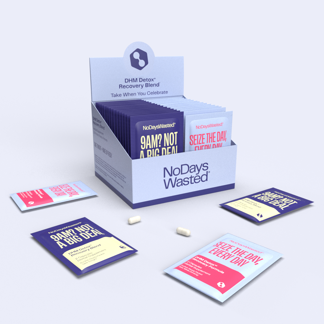 DHM detox assists with the breakdown of alcohol related toxins to help you feel better the next day. It's a vegan blend of antioxidants, anti-inflammatory ingredients, vitamins and electrolytes that are optimized to help fight the negative after effects of drinking. Take 2 capsules (1 packet) during your evening, with water.