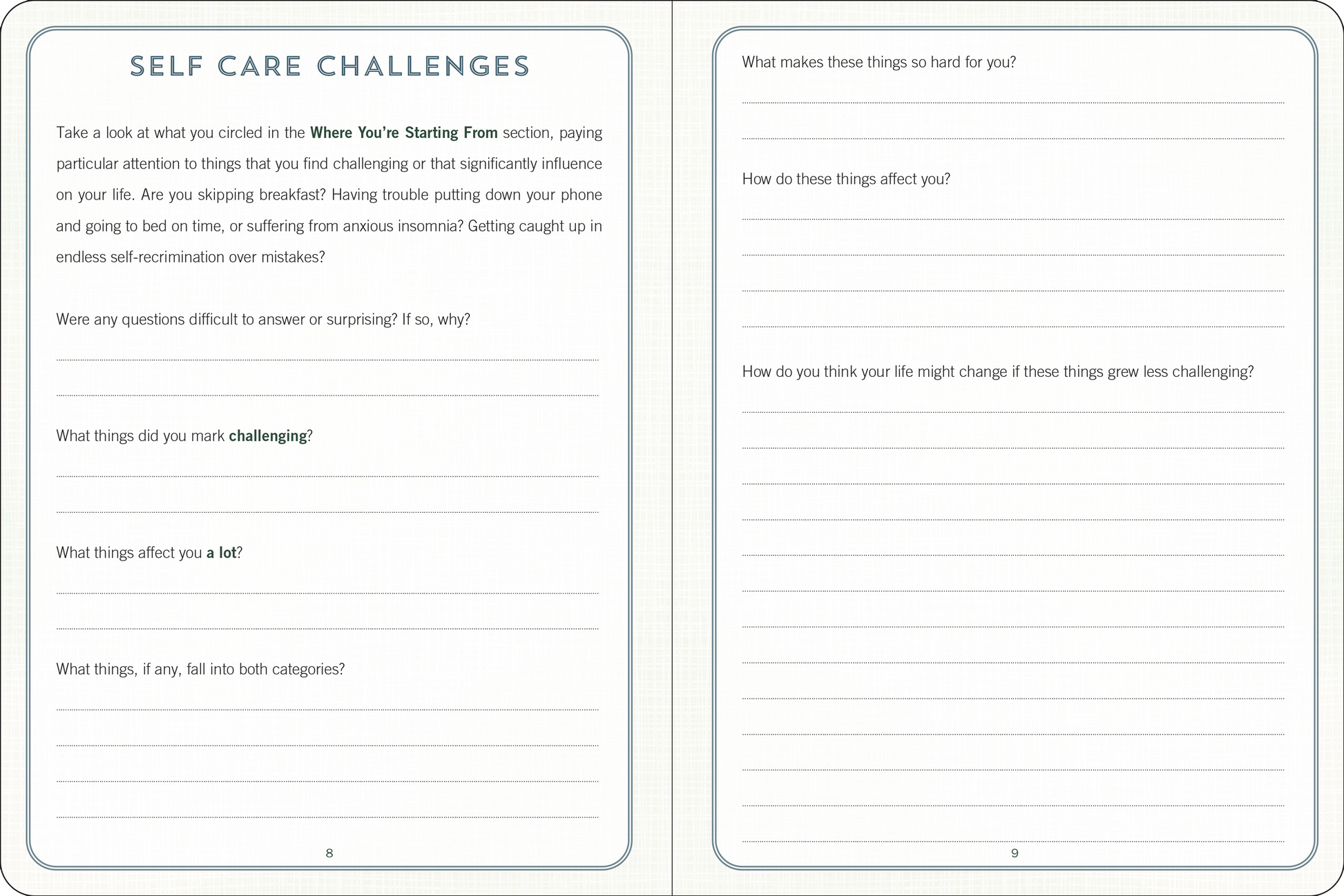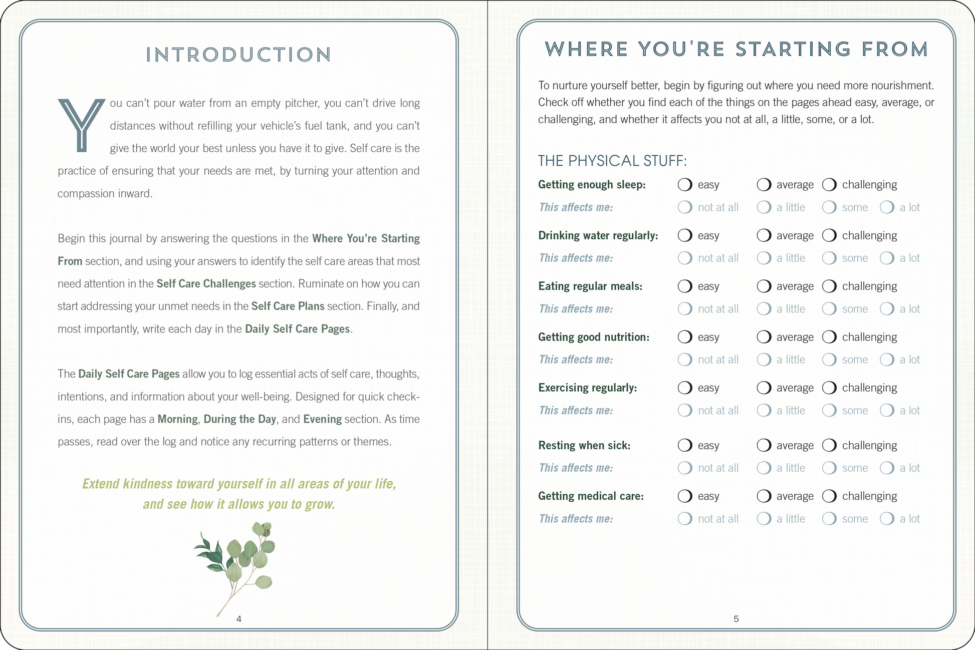 Burnout runs rampant in modern life, but self-care offers a path to renewal. Let this lovely journal guide you as you learn to nourish mind and body, take stock of your needs, and find ways to fulfill them. Contents include: Introduction, Where You're Starting From (The Physical Stuff, the Mental Stuff, the Interpersonal Stuff), Self-Care Challenges, Self-Care Plans, and Daily Self-Care Pages. Daily pages offer space to keep tabs on your well-being, examine causes of stress, check in with your feelings, and practice self-compassion. Use this journal to get back in the habit of being kind to you! Archival-quality acid-free 120 gsm paper supports pen or pencil. A matching ribbon bookmark keeps your place. Sturdy hardcover binding. 160 pages for journaling five months of daily self-care. Journal measures 6-1/4'' wide x 8-1/4'' high.